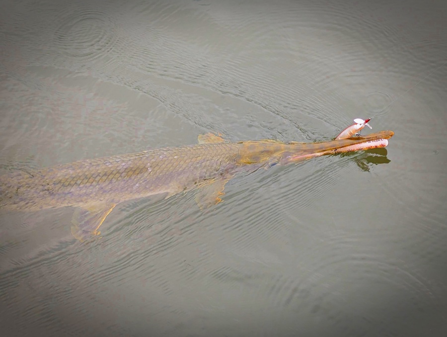 The Gar are actually tough to bite, but I’ve found that slowly drifting topwater lures works well!