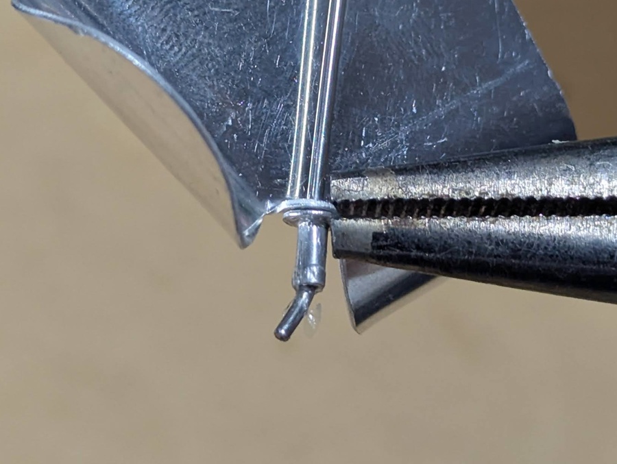 まずは作業をやりやすくするため、ワイヤーの端を曲げ戻し、ペラとリベットを抜き取ります。