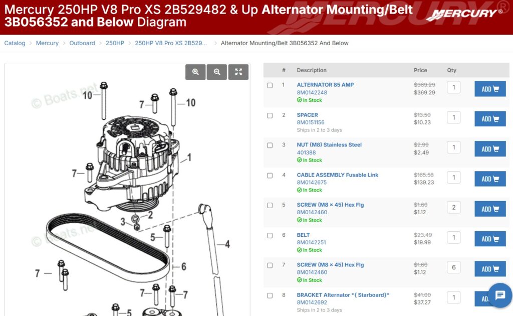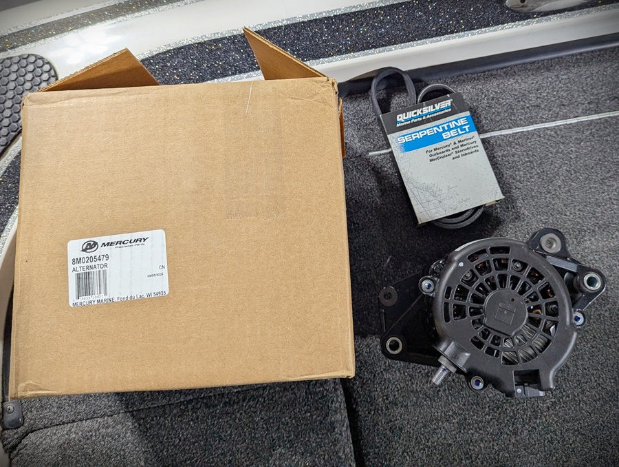マーキュリーproXS250のオルタネータが壊れたので、使い込んだベルトと一緒に交換。