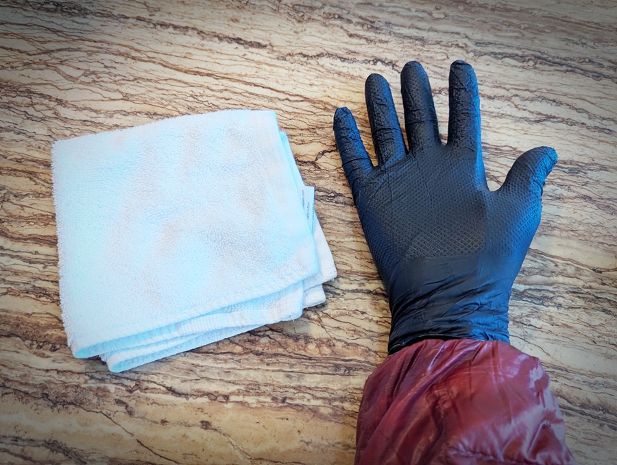 次に使い捨てのニトリル手袋を重ねますが、こちらは大きめを選ぶのがコツ。