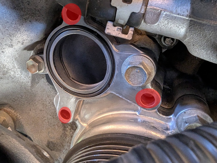 3本の12mmボルトでウォーターポンプに共締めされているので、見にくいですが頑張って探しましょう。