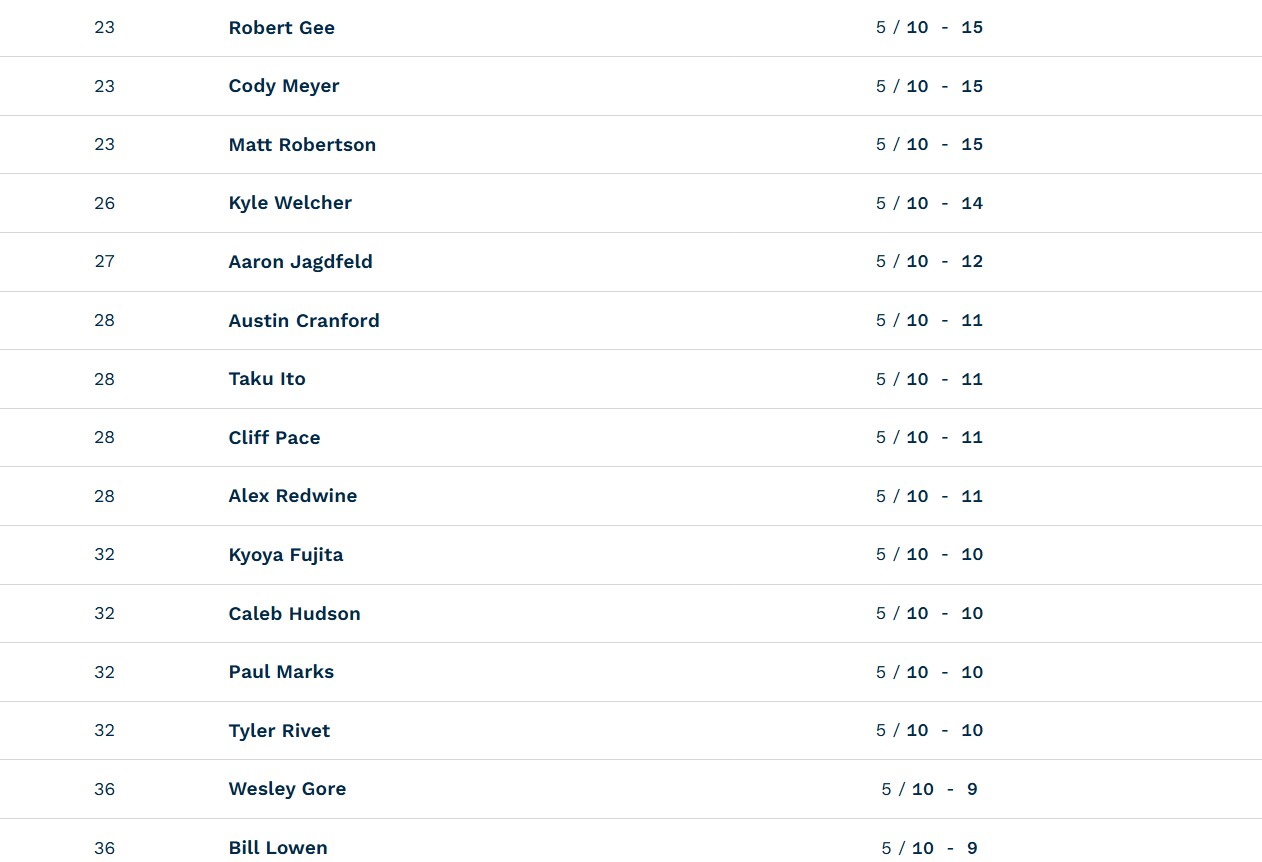 オーストラリアのカール・ジョーカムセンが6位、クラシック制覇のイーストン・ファザギルとジョーダン・リーが7位に並びます。