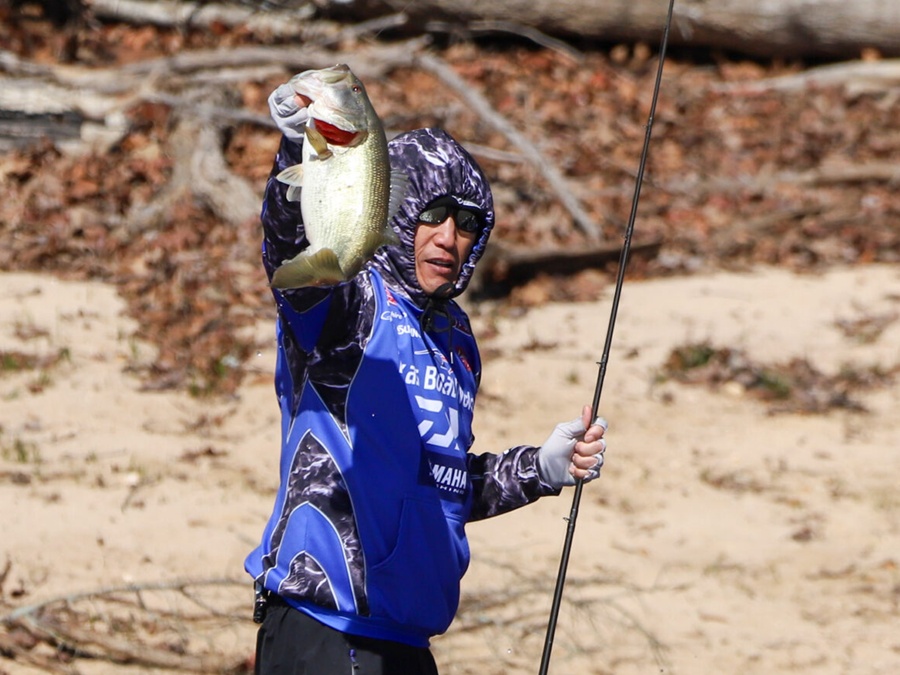 Takahiro Omori dominated Lake Hartwell by targeting largemouth in the muddy shallows.