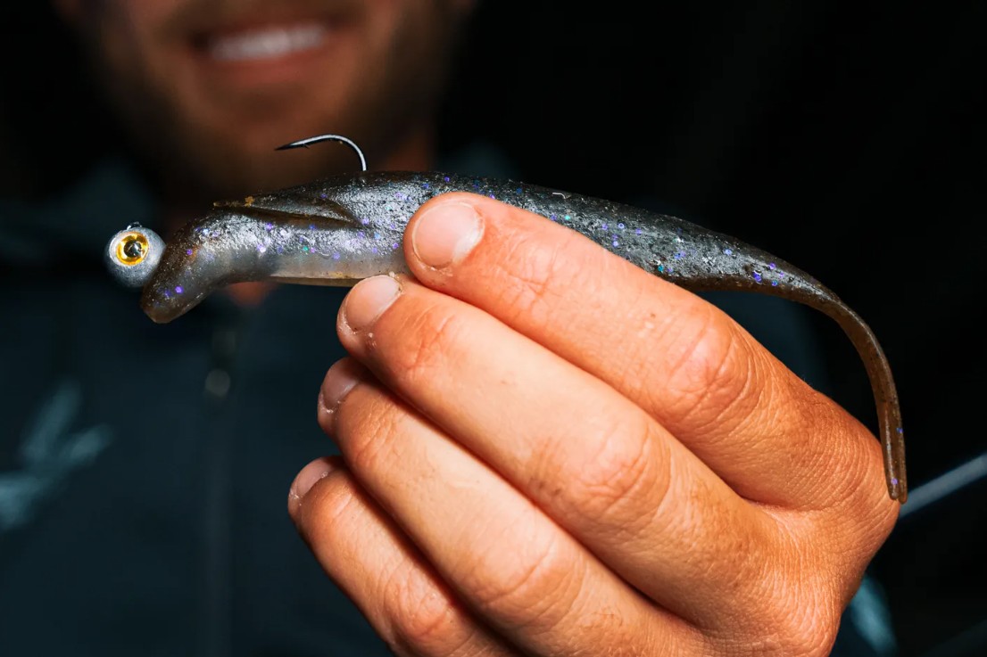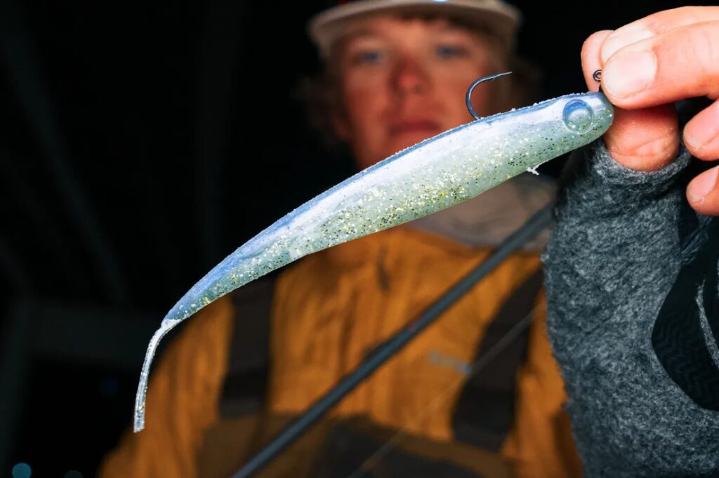 The basic setup: a 90° round eye jig head around 3/16oz paired with a 5″ Sakamata Shad.