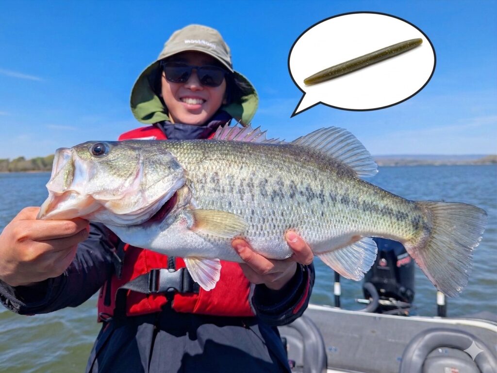 The Senko: a timeless classic for the mid-spawn season. My son just broke his personal best with a 5lb bass using one! All you need to do is drag it super slowly on a light Texas rig, or just “do nothing” with a weightless setup.